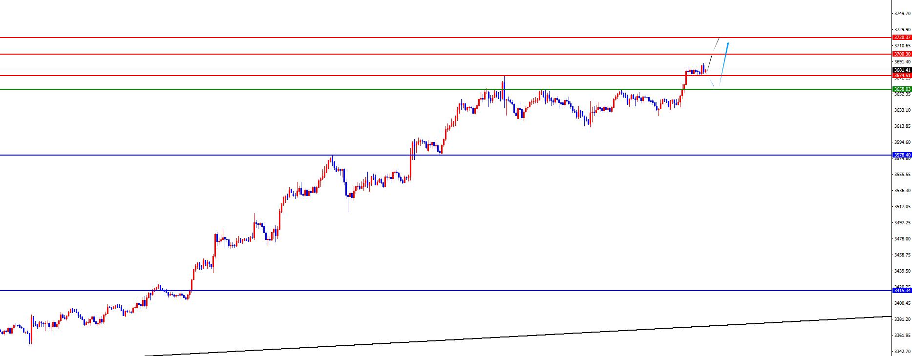 According to breaking down, then pay attention to gold's long range of 3657-58, with a defense of 10 US dollars, and a target of 3690-3720