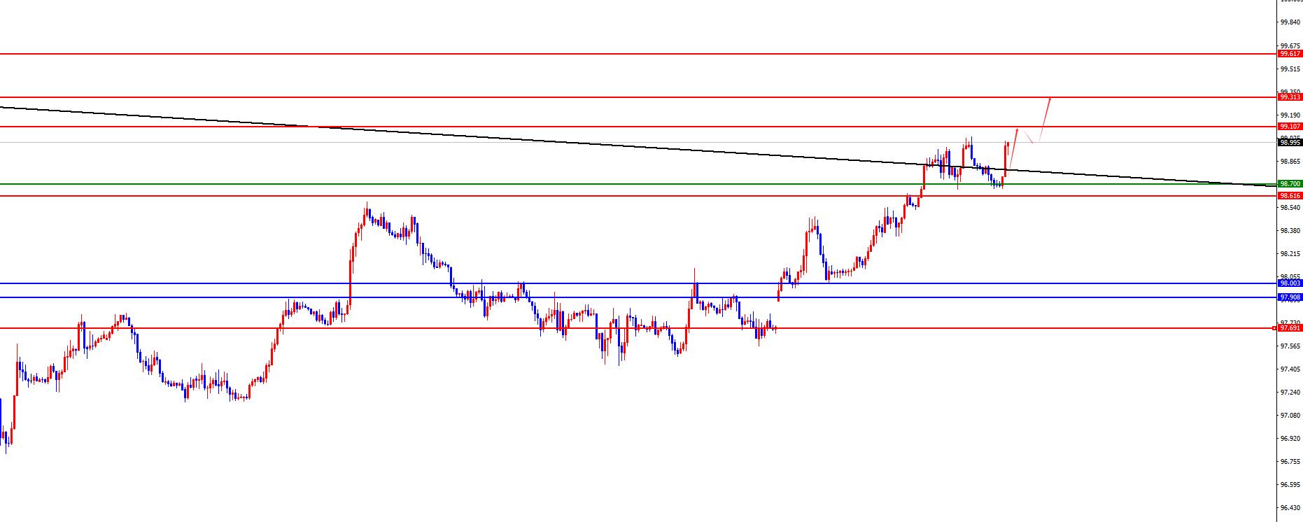 Aus der Perspektive der Multi-Zyklus-Analyse hat sich der Preis auf Wochenebene in letzter Zeit auf und ab der wichtigen Wochenlinie konsolidiert. Die aktuelle wöchentliche Unterstützung liegt im Bereich von 97,90. Wir werden weiterhin wöchentlich darauf achten, ob der Kurs über dieser Position schließt. Sobald es über dieser Position schließt, steigt die Mittellinie anschließend an. Vom Tagesniveau aus liegt die aktuelle Tagesunterstützung im Laufe der Zeit im Bereich von 98, und die Preisspanne oberhalb dieser Position wird weiter ansteigen. Aus einer Vier-Stunden-Perspektive stand der Preis zu Beginn der letzten Woche beim Vier-Stunden-Widerstandsniveau unter Druck. Der Preis durchbrach und stieg letzten Donnerstag und kehrte dann am Freitag auf die Tageslinie und die Vier-Stunden-Unterstützung zurück. Die gesamte Vier-Stunden-Unterstützung liegt derzeit bei 98,60-70, und der Preis bleibt kurzfristig lange über dieser Position. Zu jeder vollen Stunde schwankte der Preis in der Nähe der gestern hervorgehobenen Trendlinie. Derzeit ist der kurzfristige Kurs noch bullisch, so dass er vorerst lange bleiben wird, bis die Vier-Stunden-Unterstützung nicht unterschritten wird. Erst wenn es nach unten durchbricht, wird die Lücke geschlossen. Im Moment kann ich es als eine Handelsmethode auf der rechten Seite betrachten.