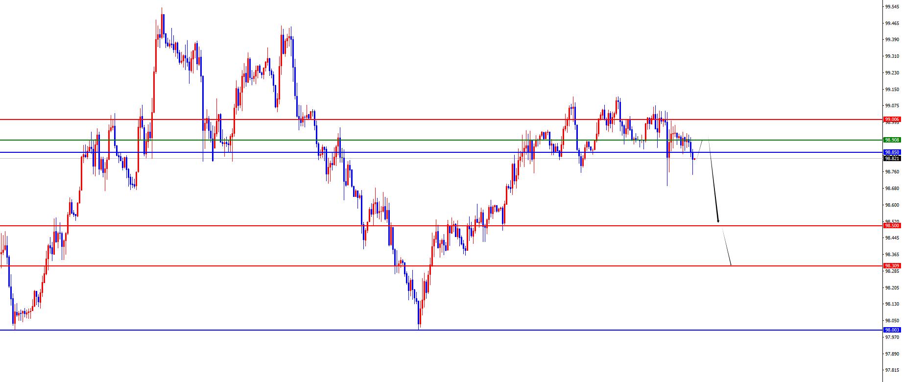 Aus einer Multi-Zyklus-Analyse geht hervor, dass der wöchentliche Preis in der Anfangsphase weiterhin schwankte, aber im Allgemeinen durch die Schlüsselposition des wöchentlichen Preises gestützt wird. Die aktuelle wöchentliche Unterstützung liegt im Bereich von 98, und anschließend wird auf weitere mittelfristige Bullen geachtet (man muss auf die Gap-Position achten). Vom Tagesniveau aus liegt der aktuelle Tageswiderstand im Laufe der Zeit im Bereich von 98,85. Diese Position ist der Schlüssel zum Trend der Band. Der kurzfristige Preis wird es durchbrechen. Der Schlüssel besteht darin, nachzuverfolgen, ob der Markt tatsächlich unter dieser Position schließen kann. Sobald es zusammenbricht, konzentrieren Sie sich auf den Druck auf das nächste Band. Auf dem Vier-Stunden-Niveau konsolidierte der Preis am vergangenen Freitag auf und ab an der Vier-Stunden-Schlüsselposition und durchbrach gleichzeitig die Tagesunterstützung. Der Preis zeigt derzeit weitere Abwärtstrends, daher sollten Sie sich kurzfristig auf den Widerstand im Bereich 98,90-99 oben und 98,50-98,30 unten konzentrieren.