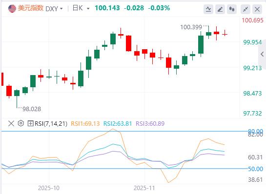 Am vergangenen Freitag blieb der US-Dollar-Index stark und erreichte während der Sitzung einen neuen Höchststand seit fast sechs Monaten, trotz der gemäßigten Rede des „dritten Führers“ der Federal Reserve, die zu einer Erholung der Erwartungen für eine Zinssenkung im Dezember führte. Derzeit notiert der US-Dollar bei 100,13.