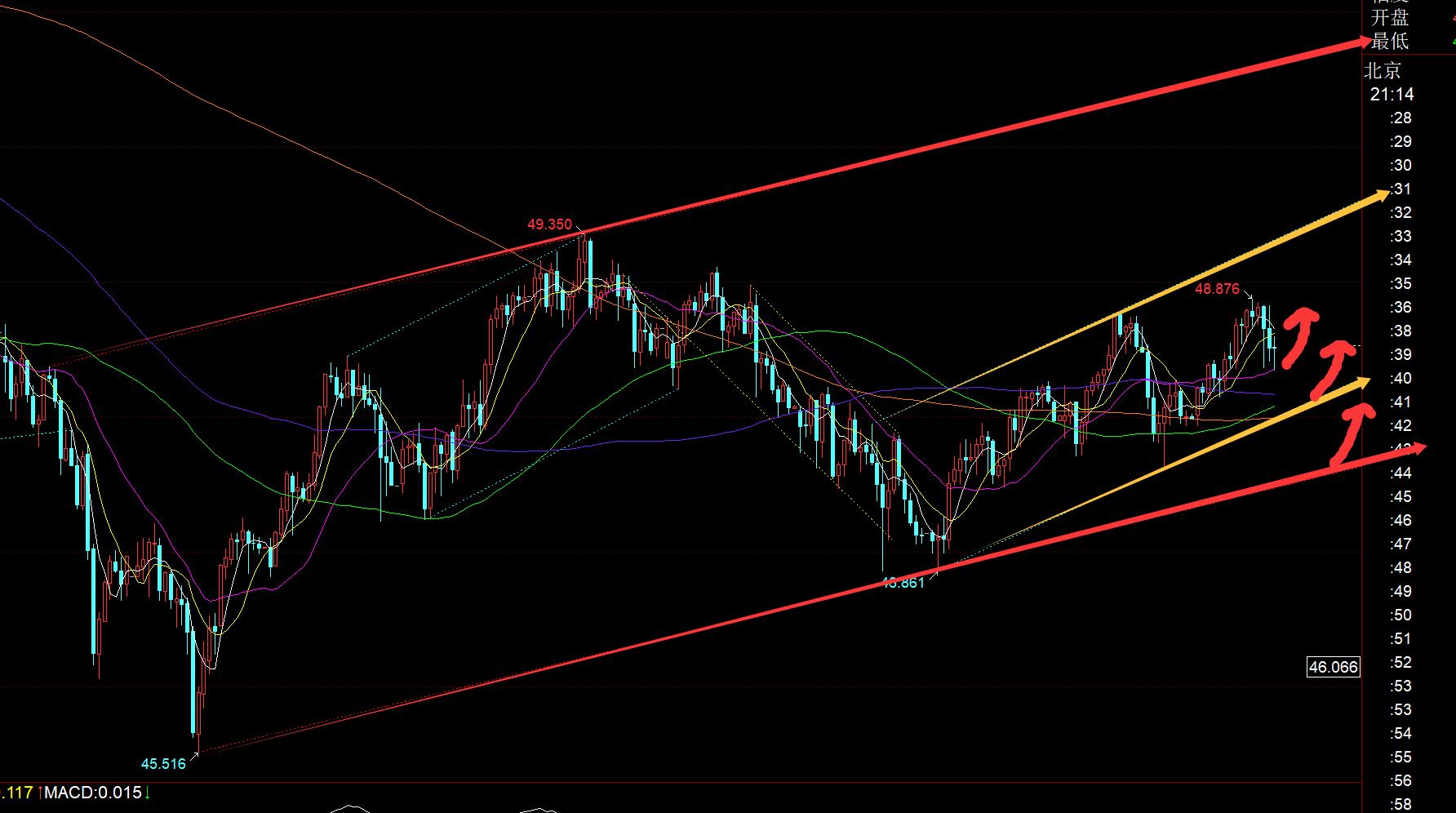 Silver: From the picture above, it is also in the upward channel of the red channel, while the small channel is in the yellow upward channel. The current hourly mid-rail support is 48.35, and the intraday 618 split support is 48.3. First, pay attention to its support stabilization; while the lower rail support of the yellow channel is 48. There is also a stabilizing rebound at this position. If it is weaker, it will be the lower rail support of the red channel 47.6; therefore, For shocks, pay attention to the support and stabilization signals of these three places tonight. If you test the bottom and pull up K or Dayang K, you can try to step in and test if you step back in the next hour. The resistance is 48.85 and 49.4;