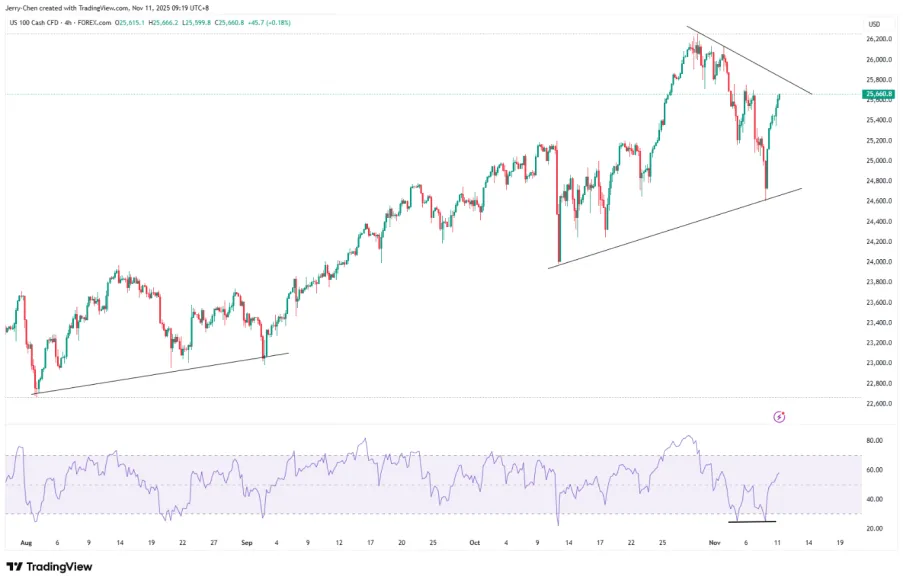 Si prevede che la liquidità del mercato ritornerà se il governo degli Stati Uniti riaprirà i battenti. Allo stesso tempo, Trump ha anche affermato che prenderebbe in considerazione l’idea di emettere un “dividendo tariffario” di 2.000 dollari per la maggior parte degli americani. Si prevede che l'ottimismo continuerà a stimolare il rialzo dell'indice Nasdaq 100 all'inizio di questa settimana.