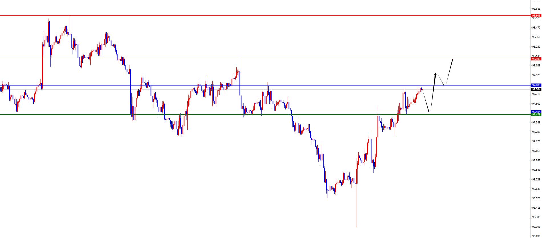 다중주기 분석에서 주간 수준은 최근 주간 라인의 주요 통합이었습니다. 현재 주간 저항은 97.80 지역에 있습니다. 이번 주 에이 직책이 확고한 지 여부에주의를 기울이는 것이 중요합니다. 일단 확고 해지면 중기 황소가 계속 될 것입니다. 일일 수준에서 시간이 지남에 따라 Daily Line은 현재 97.50 지역을 지원하고 있으며 현재 가격이 상승하고 있습니다. 이 위치에서의 지원에 따라, 그것은 증가를 더 살펴볼 것입니다. 4 시간의 관점에서, 4 시간 저항은 지난 수요일 밤새도록 깨졌고 4 시간 동안의 가격이 상승했습니다. 현재 4 시간의 지원은 97.50입니다. 가격은 현재이 위치보다 낙관적이며, 그 후에 중점은 매주 저항의 실제 안정성에 중점을 둡니다. 가격은 단기적으로 1 시간 동안 변동하고 상승합니다. 현재 97.50-60 범위의 지원에 중점을두고 있으며 주간 저항이 깨지면 계속 진행됩니다.