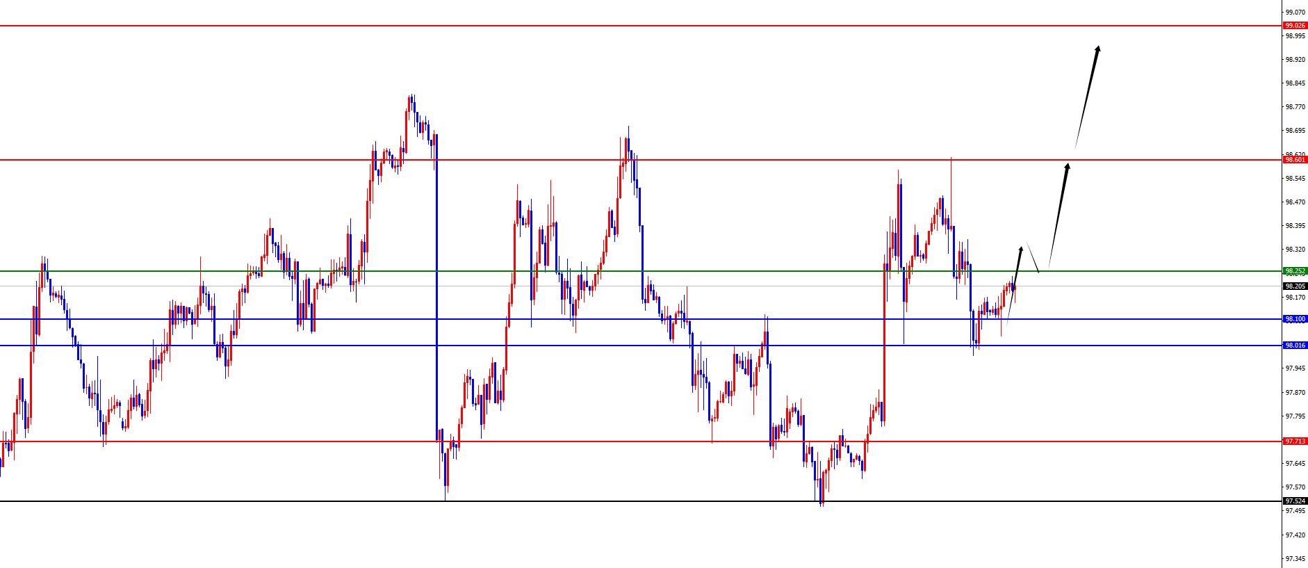 从多周期分析,周线级别来看近期价格在周线关键上下盘整,目前周线阻力于98区域,价格在周二再度向上突破,昨日价格继续回踩,目前在此位置之上继续按照震荡偏中线多对待。从日线级别看,暂时需要关注98.10区域支撑,所以目前价格只要没有收盘在日线及周线支撑下方继续偏波段多对待。四小时上暂时关注98.25区域的站稳,站稳后将继续延续。一小时上目前同样偏多,上方重点关注98.60-99区域。