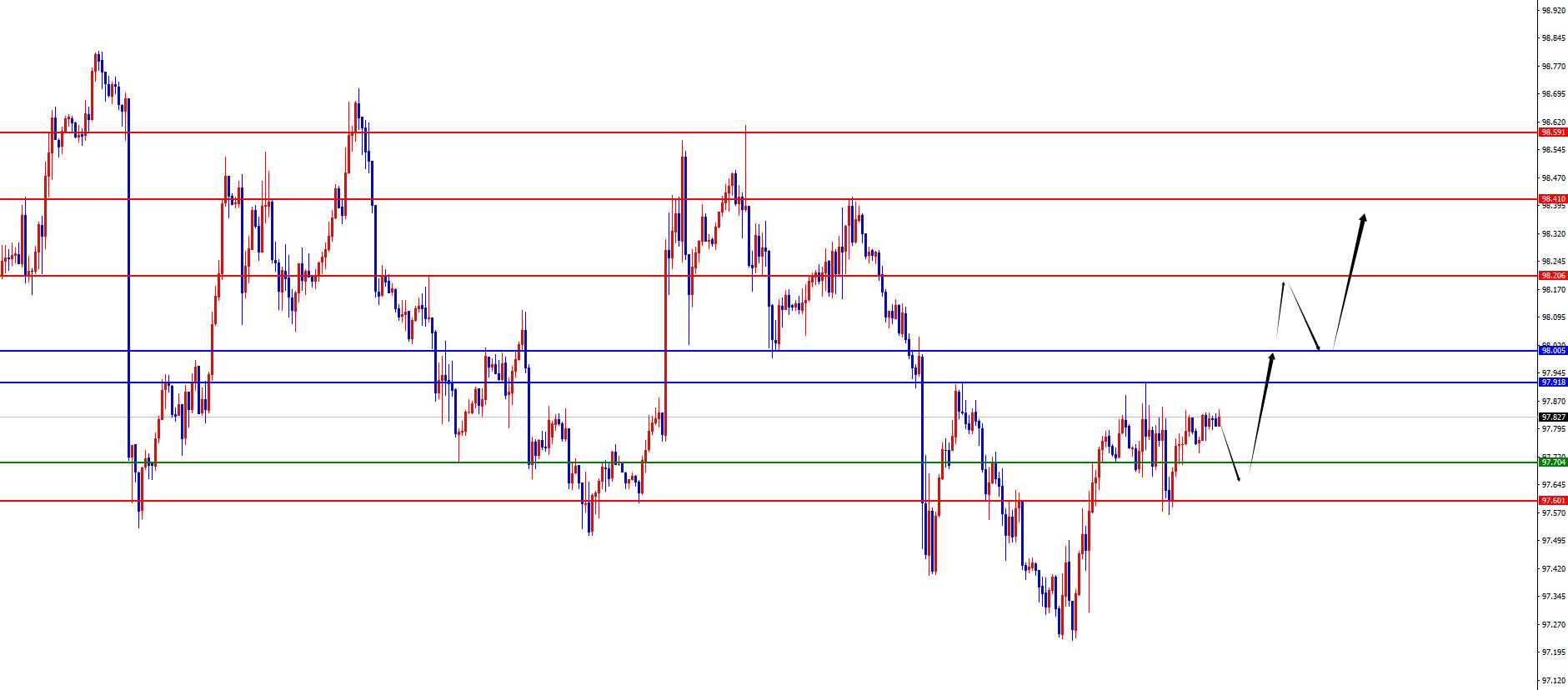 从多周期分析,周线级别来看近期价格在周线关键上下盘整,目前周线阻力于97.90区域,价格在此位置之下偏空对待,价格只有后续周线收盘在此位置上方才会转多。从日线级别看,随着时间的推移目前日线阻力于98区域,目前需要关注价格能否站稳日线及周线共振阻力是关键。从四小时上看,昨日如期回踩四小时支撑后进一步上涨,目前价格依旧在四小时支撑上方,今日重点关注97.60-70区间支撑,上方关注97.90-98区间站稳状态。一小时上目前短线呈现震荡上涨,所以继续等待回踩支撑后上行,价格后续站稳关键阻力后才会持续发力。