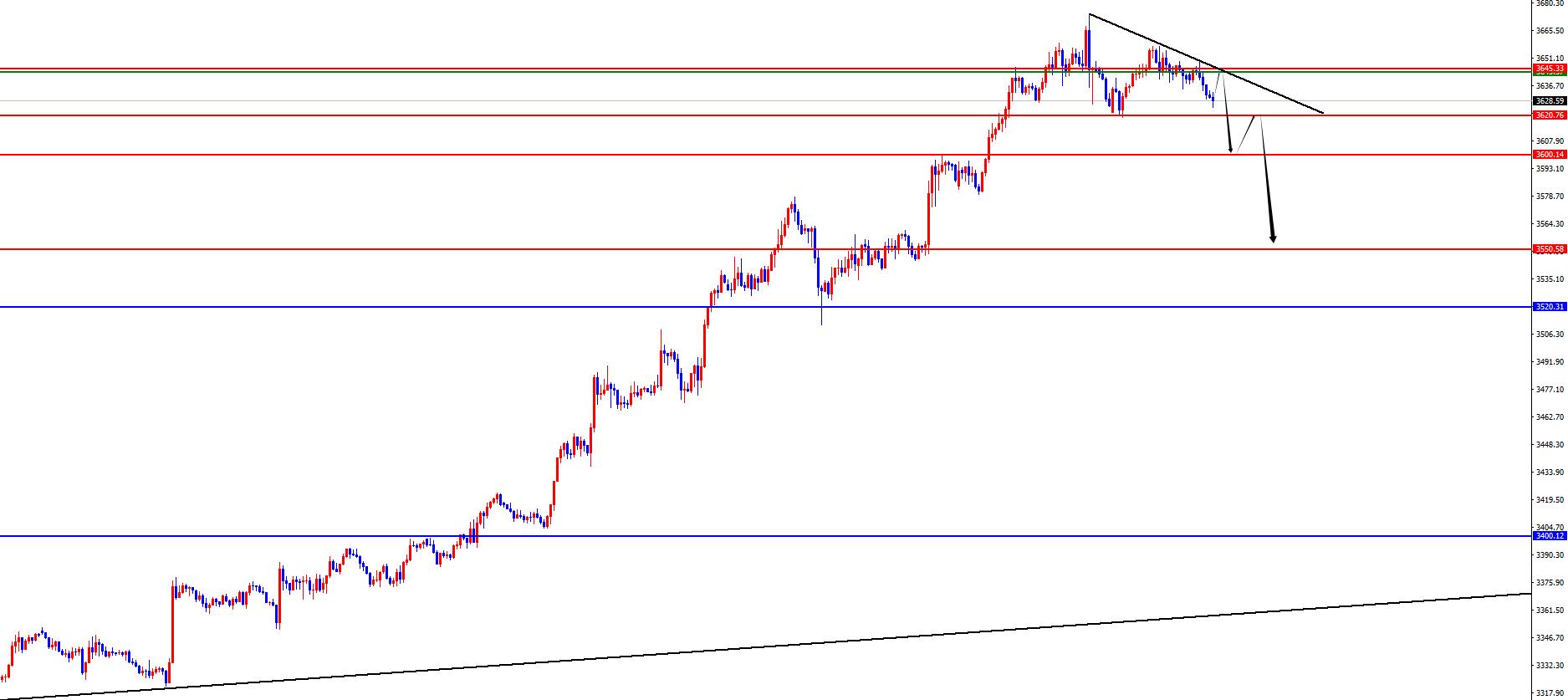 从多周期分析,首先观察月线节奏,月线上价格8月份大阳收尾,整体看价格依旧多头运行,从长线上看3000位置是长线走势的分水岭,价格在此位置之上长线多对待即可。从周线级别看,价格经过近期持续震荡后突破关键阻力,目前持续再创历史新高位置,目前周线多空分水岭于3400位置,价格在此位置之上中线多对待即可。从日线级别看,暂时需要关注3518区域支撑,此位置之上波段多对待。从四小时上看,前期价格维持在四小时支撑上方运行,但是昨日跌破此区域,所以目前3644-3645区间成为关键阻力,后续关注此位置承压。一小时上看目前价格延续承压,后续重点关注3620-3600区域,如若极弱的表现下则关注3550-3520区域。