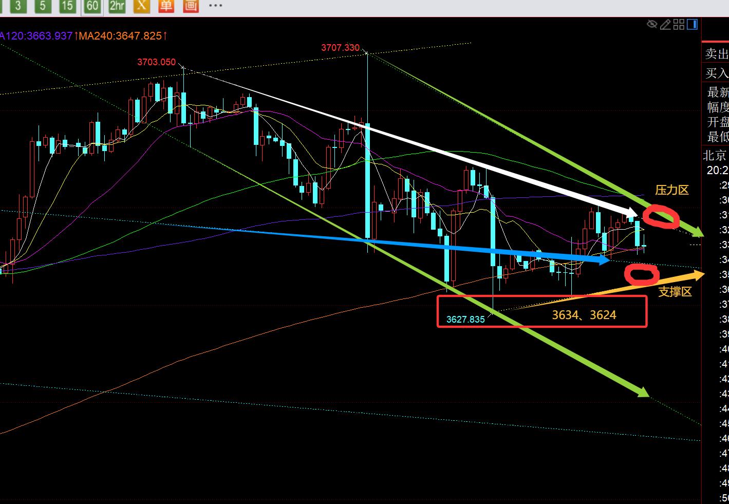 第一,黄金方面:昨日一天都在来回撸串,日内短线变化急速,亚盘,欧盘,美盘来回V,没延续性;亚盘延续隔夜下跌一波,这个可以理解,欧盘跌至3634又马上大阳反拉,就是图中蓝色通道上轨的一种诱空假破位,随后欧盘连阳强势V,刺破亚盘高点3672,美盘就尝试看二次延续上行,然后再次V回去破新低,这个的确没想到;同样也只是刺破欧盘低点3634,因此后半夜震荡稳住3634就可以尝试看一波拉升,最高试探3660一线;
