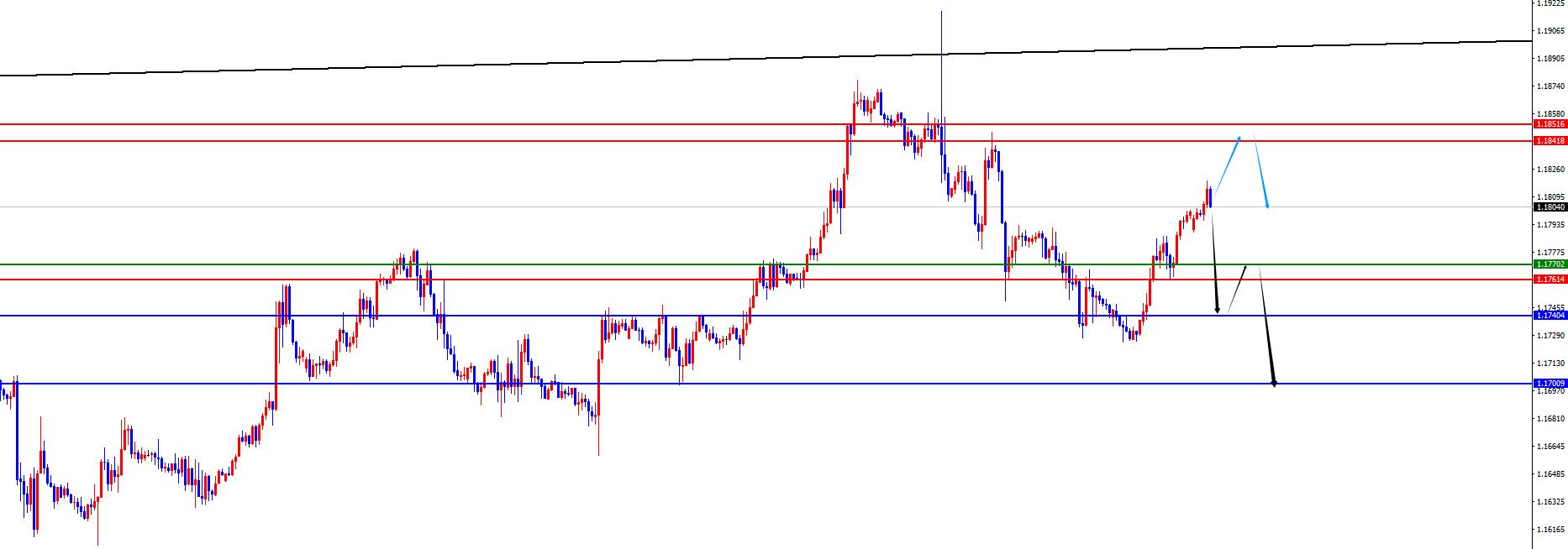 从多周期分析,从月线级别来看,欧美受撑于1.1060位置,所以价格在此位置之上长线多头对待。从周线级别看价格受撑于1.1700区域的支撑,此位置是中线走势的多空分水岭,目前有下破周线支撑的表现,所以后续重点关注。从日线级别,随着时间的推移目前日线支撑于1.1755位置,此位置作为波段走势的关键分水岭。同时按照四小时级别看,随着时间的推移目前四小时支撑于1.1760-70区间,后续下破后继续看延续。一小时上早盘再度上破前一日高点位置,短线关注调整还有继续承压,位置上关注1.1840-50区间阻力看承压,或者价格下破四小时支撑后再看承压,下方后续继续关注周线支撑1.1700位置及后续下破表现。