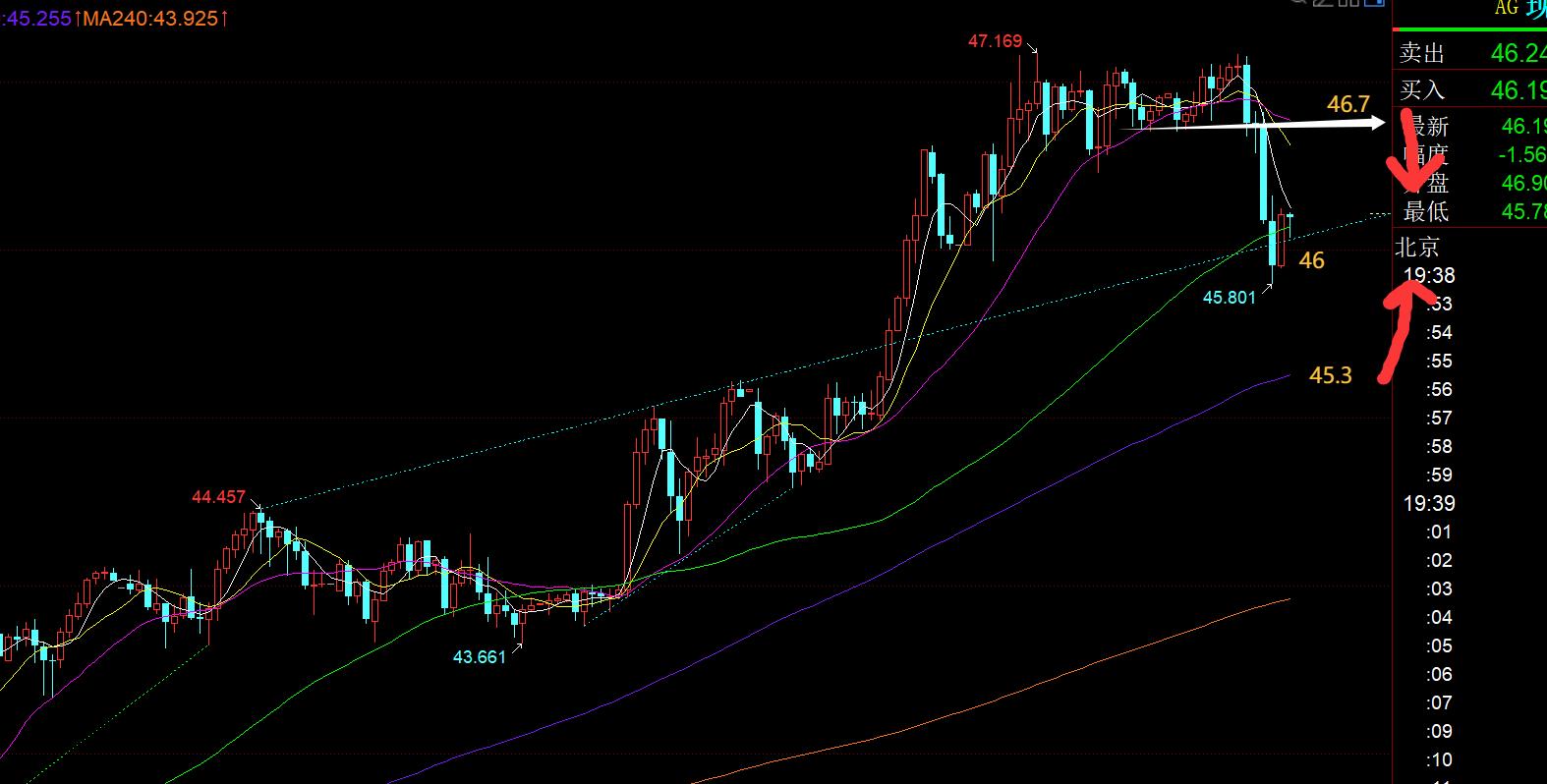 第二,白银方面:昨日早间探底拉升,小时线收盘稳定于10均线,维持逼空拉升走法,则早间指出46.25上继续看涨,成功抵达47关口收米;欧盘回踩依托顶底支撑46.6上企稳,继续看涨,反复给到47目标收米;
