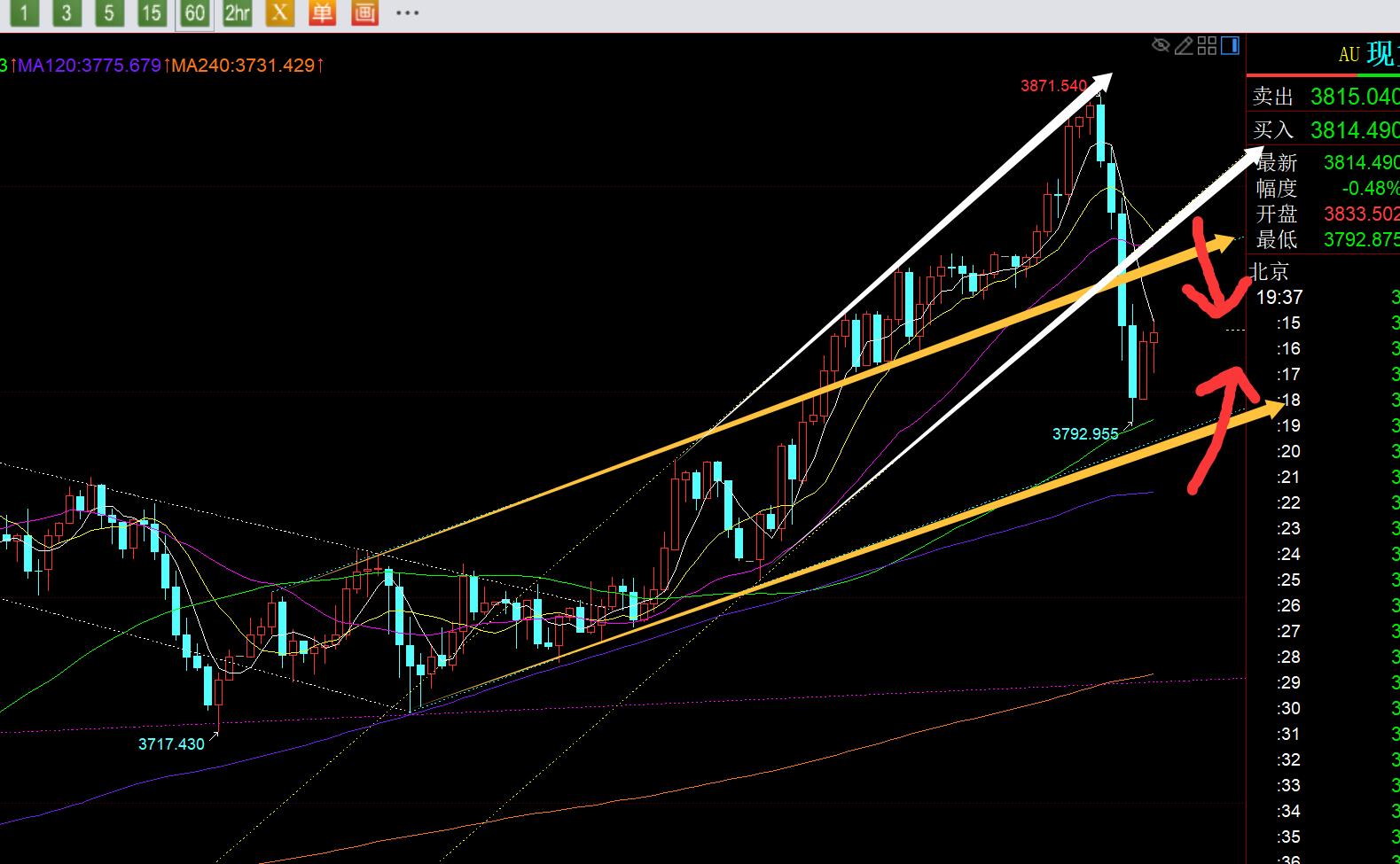 接下来,今晚预计震荡修复了,从高位打压下来低位,已有80米,再往下空间也不会太大了,首要支撑是图中黄色通道下轨位置,也是顶底点3790一线,其次是半年线支撑3776上,刚好对应日线5均线;阻力则是黄色通道的上轨反压点3830-35一线,也是50分割阻力,还有就是3841一线,618分割阻力,白色通道的下轨反压点(这个白色通道没提前画出来,日内高点刚好承压其上轨);因此,就依托支撑和阻力之间做震荡修复对待,然后就看上下得失,若重新站上3830、3835,乃至3841,那么短暂回调瞬间结束,回归强势拉升;若跌破3790,甚至3775向下,则下跌调整延续扩大;两边都没失守前,就按区间震荡对待;