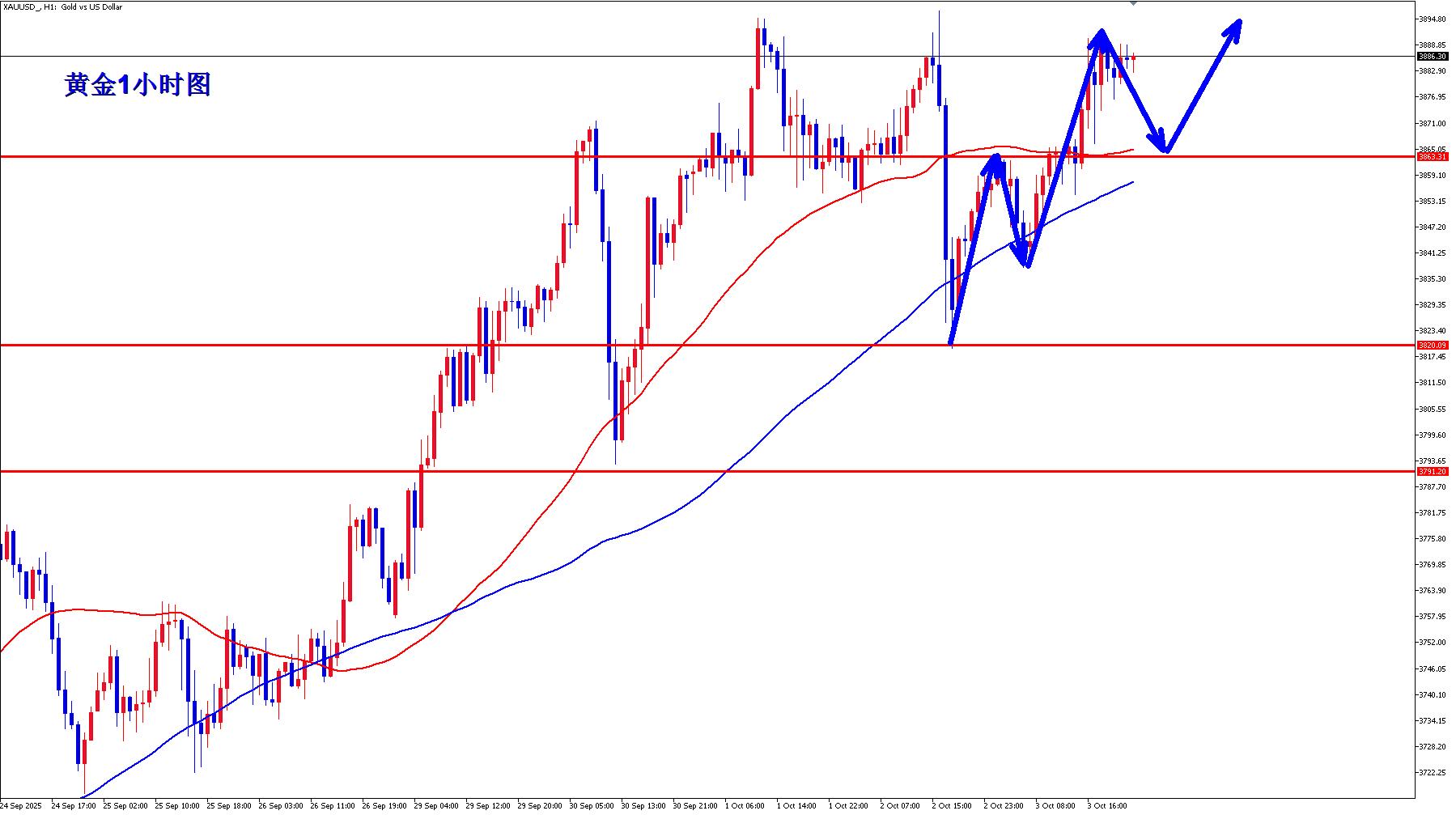 因为美国政府停摆,很多经济数据也不发布,行情的不确定性也就相应增加,黄金现在日线整体还是偏强势,下周回落还是顺势做多为主,不过需要留意的是需要耐心等待回落的机会,毕竟现在1小时高位三重顶的结构依然存在,如果黄金向上突破,那么回落顺势多,不然不排除黄金短线承压先回落调整,下方关注3863支撑再顺势多。