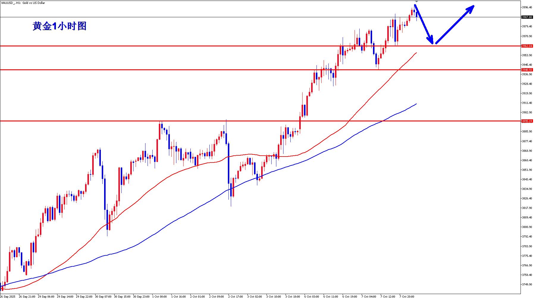 黄金1小时均线现在继续金叉向上的多头发散,黄金多头气势如虹,稳步上涨,黄金昨晚美盘突破新高之后,黄金回踩3962就开始继续上涨,黄金早盘回落3962上继续逢低做多,黄金早盘触及4000一线回落就是蓄势,然后回踩之后蓄势再待突破,这也是最近黄金每次整数关口都是如此。