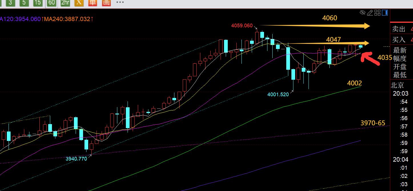 第二,黄金小时线级别:早间一根大阴急跌,失守10均线和中轨,则先反弹确认中轨,刚好也是隔夜高点跌至早间低点反弹的618分割阻力4037一线,跟随一波看回调,最低触及4002,有30米的利润空间;那么一波下跌之后,就逐步形成高点下移,低点下移的下滑通道,午后反弹通道上轨4028之下继续尝试看跌回落修正,但价格又突破了4037前面的开跌口,也就压制失败,通道形成失败,就要重新规划新的路线;整个欧盘其实都围绕中轨在来回横跳,延续性较差,一直处于看戏中;今晚留意10日均线4035,和昨晚一样,只有它有效破位失守了,反弹确认之后,才能向下打压一波,再去测试4000之上支撑,以及日线5均线3970上支撑;反之,4035一直坚守未有效破位,则走势依旧保持相当抗跌强势,上方就可能试探布林带上轨3460一线看得失;