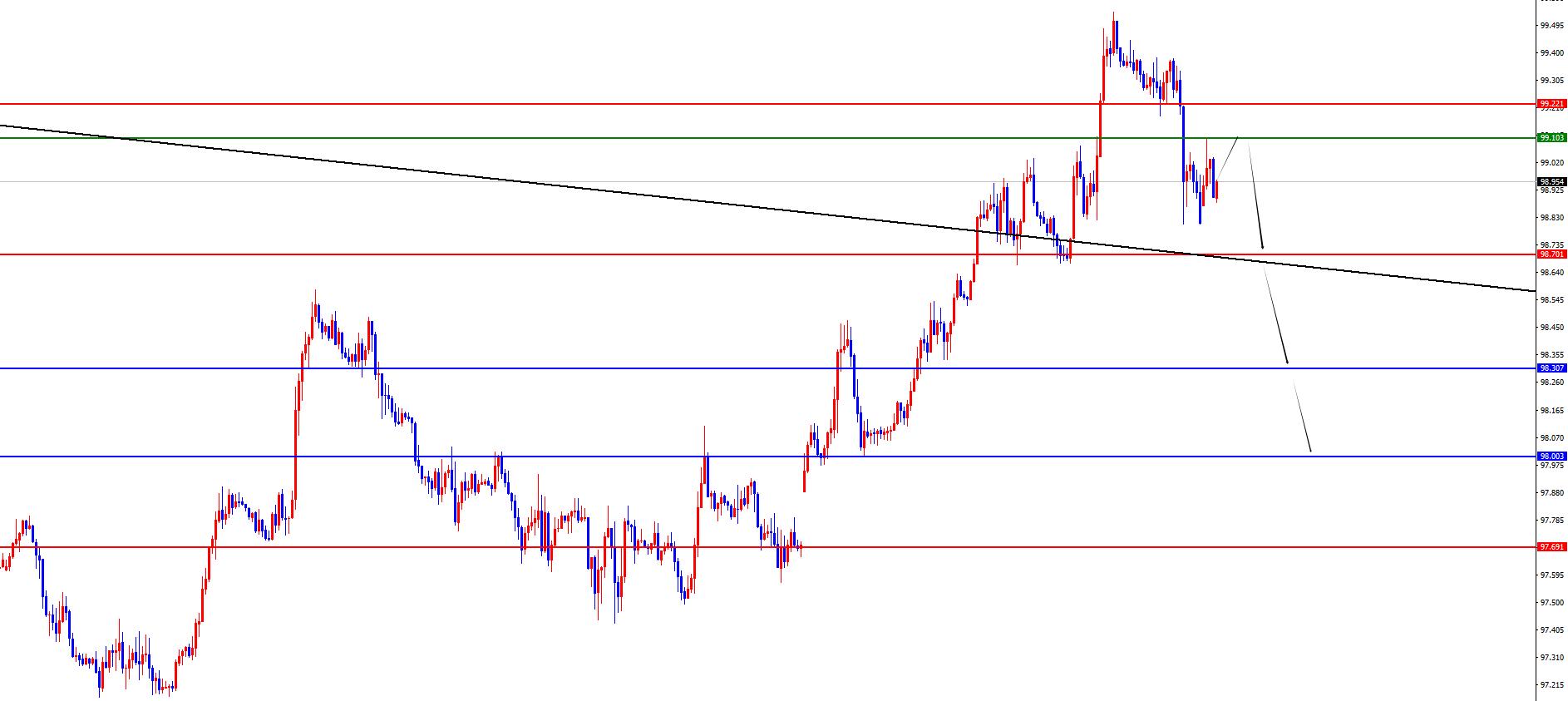 美指99.10-20区间空,防守5美金,目标98.70-98.30