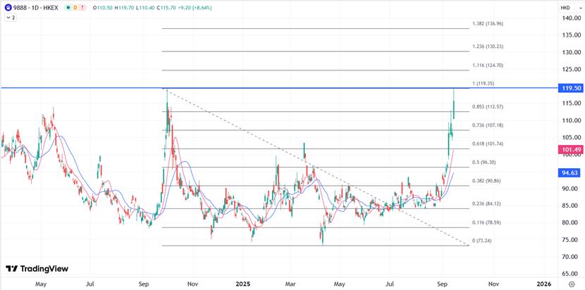 XM港股:本週由於百度(09888)傳出與蘋果公司合作,百度股價在周一大漲逾9%,創去年10月以來的高位後,今早繼續受到利好牽動而跳空高開,盤中漲近一成。最新消息稱,阿里巴巴(09988)和百度傳出已開始使用內部設計的芯片來訓練其人工智能模型,部分取代英偉達的芯片,今早阿里巴巴高開5.9%,百度高開3.8%。