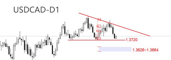 技術走勢看,USDCAD處於空頭趨勢的築底階段,目前的階段性低點在6月16日形成的1.3538點。中短期來看,USDCAD的支撐位在圖中1.3720處,最新市價1.3755,距離支撐位較近。由於今日美盤時段存在加拿大央行和美聯儲的雙利率決議局面,預計今日K線振幅較大,有可能突破1.3720點。一旦支撐位被有效突破,下方新的支撐區間在1.618~1.382附近,對應1.3626~1.3664點,建議重點關注。