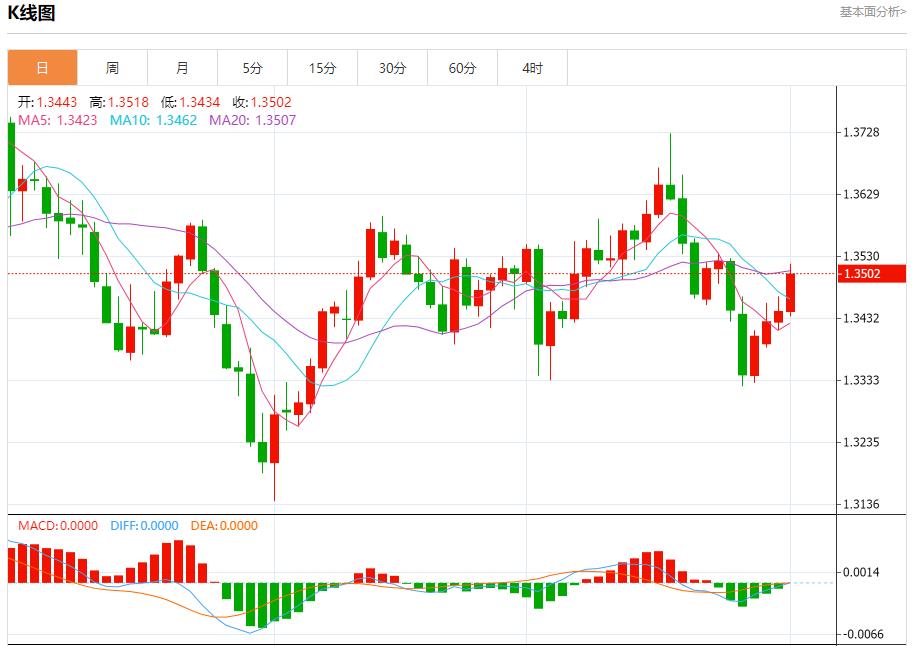 英鎊/美元:截止北京時間20:23,英鎊/美元上漲,現報1.3504,漲幅0.44%。紐市盤前,(GBPUSD)價格在日內交易的最後階段略有下跌,受到EMA50阻力位的影響,迫使其下探,尤其是相對強弱指標出現負面信號,提示形成負向背離,如果負面信號持續,將加劇下行壓力,同時在短期內看空波動占主導地位。