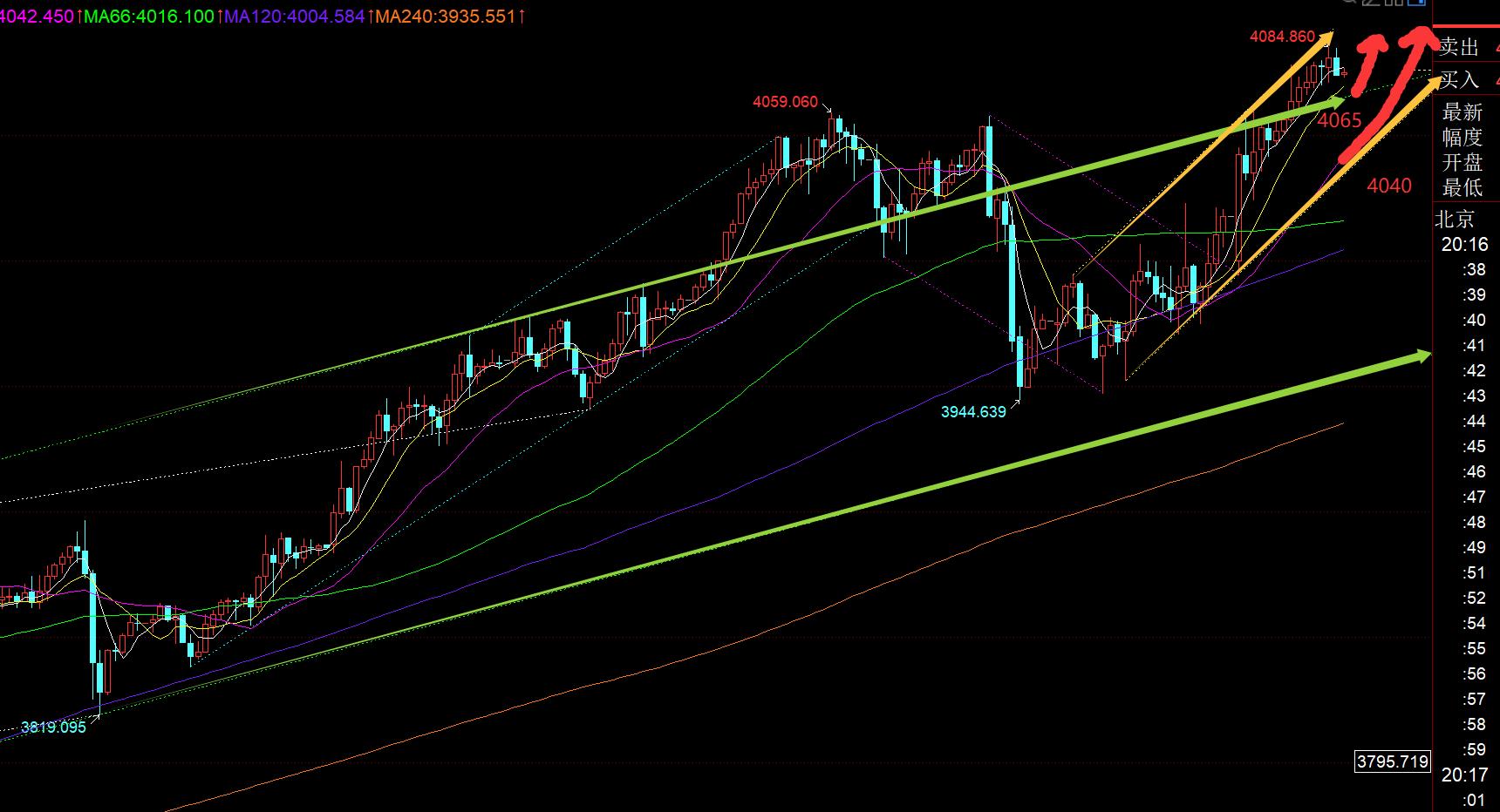 第二,黃金4小時級別:隔夜突破中軌之後,又開始連陽逼空走法,突破前高4060,那麼今晚關注5均線得失,若穩住此位置,則還能保持強勢拉升;守不住,則會下調一些,企穩10均線再拉升;