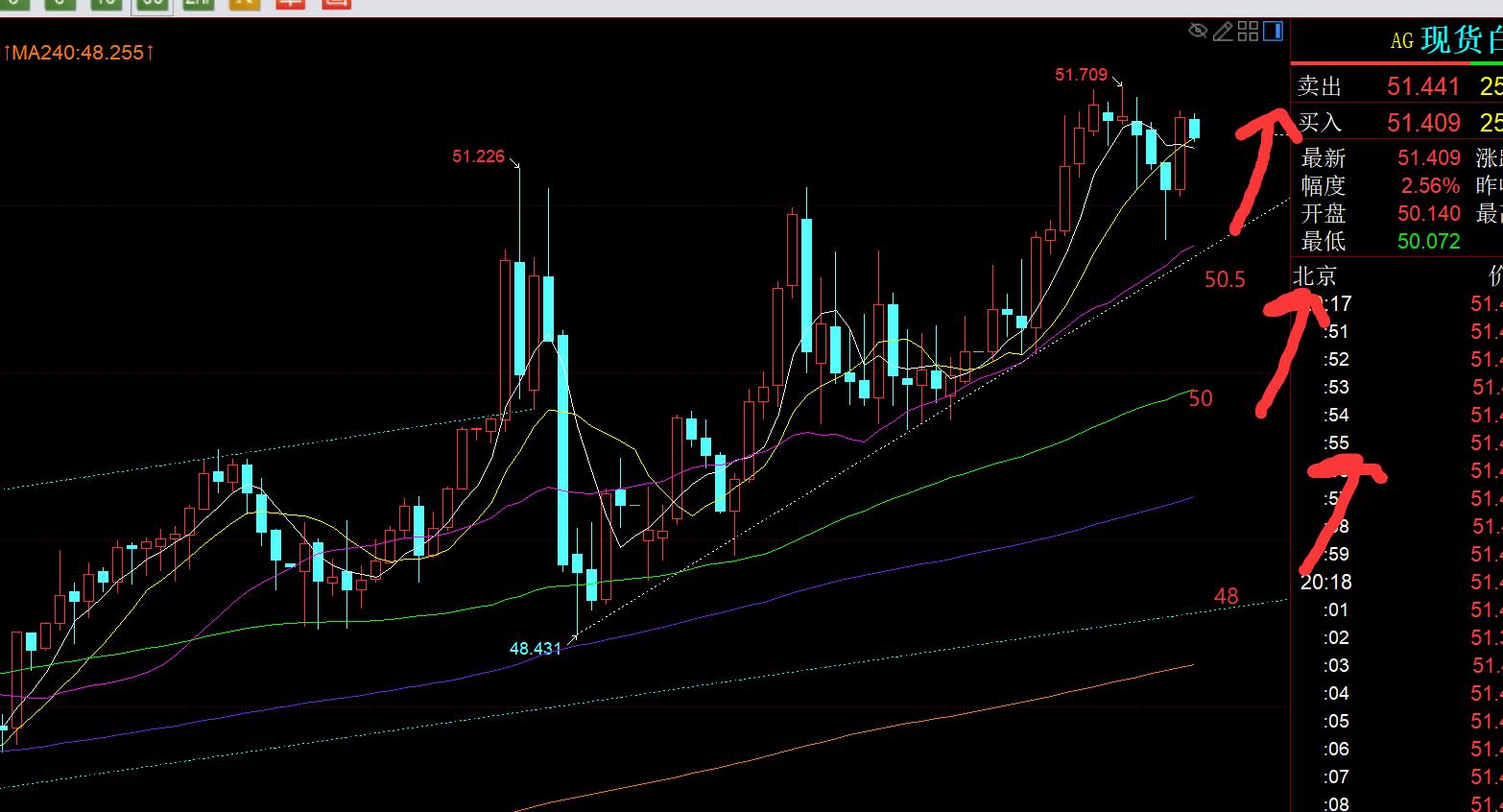 第二,白銀方面:波幅這兩日急速擴大,日內稍微動一下就是0.4-0.5,上週五亞盤提及,突破50後膽大的可直接追漲,目標51到位,只是當時防守的確不好帶,除非波段;歐盤大幅連陽拉升,再次沖擊隔夜高點51.1-51.2,則美盤前後跟隨看漲,只是比較可惜,回踩稍多了一點,剛好刺破再美盤拉升抵達原先目標;