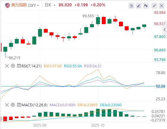 週一,美元指數維持震盪格局,最終小幅收漲0.06%,截至目前,美元報價98.82。