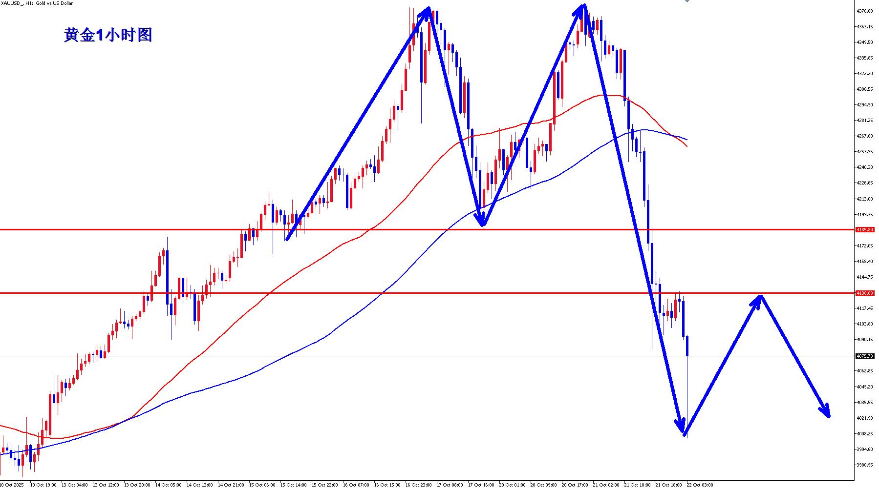 黃金昨天美盤破位頸線位之後,黃金直接順勢空,黃金如期下跌,黃金現在高位下跌,日線已經烏雲蓋頂,黃金短期空頭都能強勁,黃金沒有大的避險刺激,那麼黃金下跌將還有空間,黃金早盤反彈繼續空。