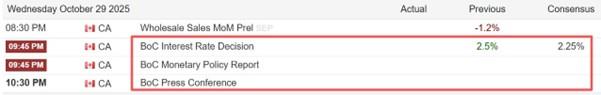 本週三21:45,加拿大央行將公佈10月利率決議結果,主流預期認為其將降息25基點。加拿大經濟發展嚴重依賴美國。今年以來,美國總統特朗普不斷提高自加拿大進口商品的關稅,疊加美國本身宏觀經濟有衰退跡象,加拿大經濟的增長前景異常悲觀。上週六,特朗普在社交媒體表示,將會對加拿大額外徵收10%的關稅,以報復其刊登批評美國關稅政策的廣告的行為。這將嚴重削弱市場人士持有加拿大元的信心。
