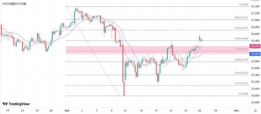 在貿易消息利好刺激下港股今早大幅高開,為近期觀望情緒濃厚的氛圍增添一些樂觀,不過消息面的利好可能偏向短線,因為市場需要看到實質性協議的跟進,以及業績期更多的利好釋出,否則港股難以有效突破27000關口,所以10、20日均線在26250至26000關口的支撐仍值得關注。