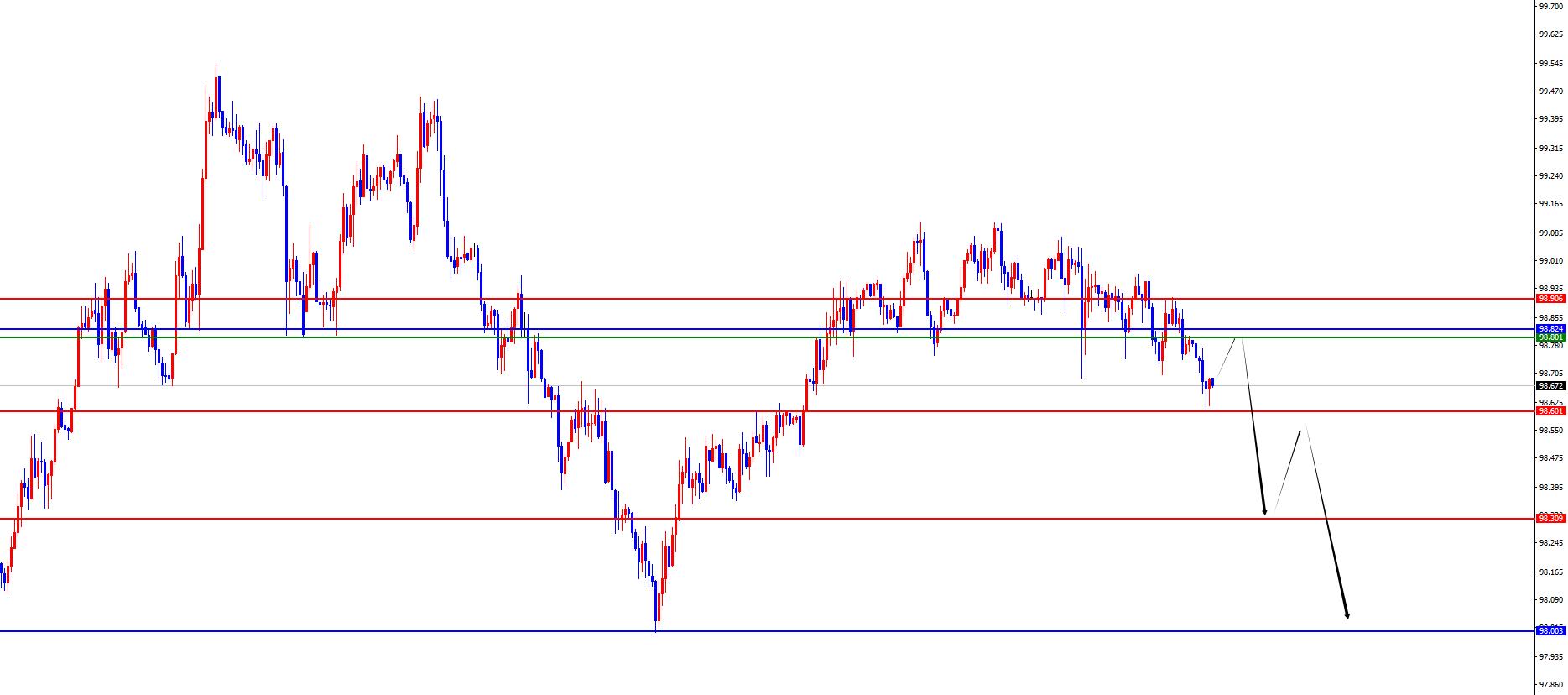 從多周期分析,週線價格經過前期持續震盪但是整體受撐於週線關鍵位置,目前週線支撐於98區域,後續關注進一步中期多頭(需要注意缺口位置)。從日線級別看,隨著時間的推移目前日線阻力於98.80區域,此位置是波段走勢的關鍵,目前價格已經進行下破,後續關注此區域持續承壓。四小時級別看,昨日價格持續承壓於四小時阻力位置,隨著時間的推移目前四小時阻力於98.70-80區間阻力,後續關注此區域繼續承壓即可。