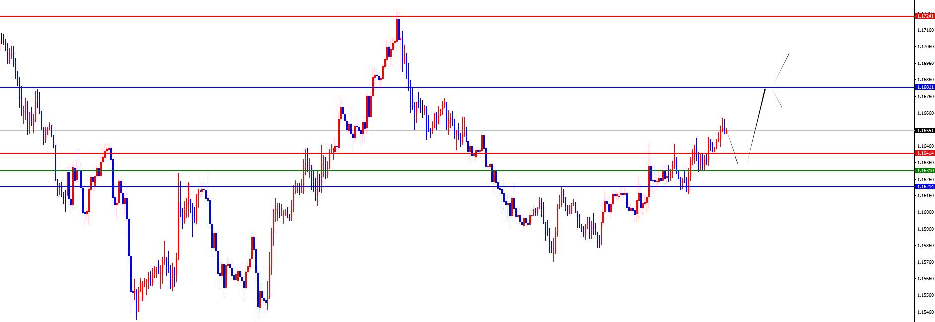 從多周期分析,從月線級別來看,歐美受撐於1.1100位置,所以價格在此位置之上長線多頭對待。從周線級別看,週線阻力於1.1680區域,此位置是中線走勢的多空分水嶺,價格在此位置之下中線偏空對待。從日線級別,日線上是我們強調波段走勢的關鍵,價格在上週五突破1.1620阻力位置,後續關注價格延續上漲。從四小時級別看,價格在上週四晚間突破四小時阻力位置,之後價格維持短期上漲,目前四小時支撐於1.1630-40區間支撐,後續關注此區域支撐價格繼續上漲,上方重點關注日線阻力1.1680區域得失,一旦上破則關注進一步延續,後續我們再做實時跟踪。