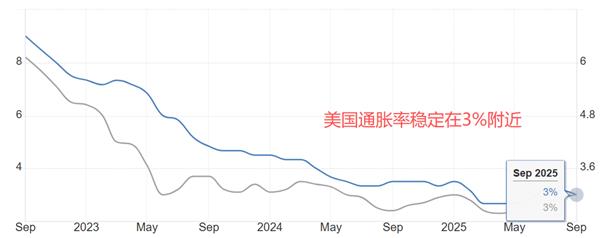 造成美聯儲內部對降息出現分歧的原因,是美國的勞動力市場數據和通脹數據不協調。傳統經濟學理論認為,勞動力市場疲軟會導致商品需求減少,通脹率往往會下降。現階段,美國的就業市場已經疲態盡顯:新增非農就業人口持續低於10萬人標準。然而,通脹率依然遠高於美聯儲設定的2%目標。 9月份核心CPI年率和名義CPI年率均為3%,高出目標水平1個百分點。更關鍵的,美國的通脹率已經進入平台期,繼續下降的難度較大。如果美聯儲降息幅度過大,可能導致通脹數據快速反彈。