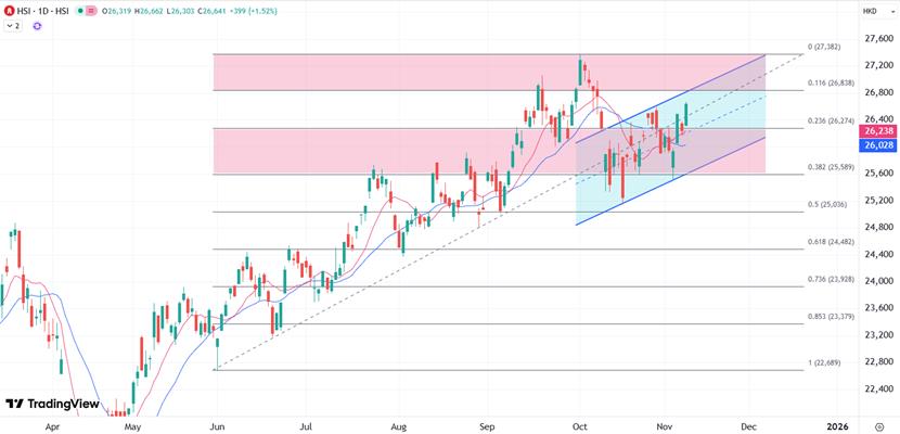恆指經過上週的周度收高後打破了此前的下行通道,當前嘗試擴大上行通道,關鍵的突破位在27000關口,更高阻力在10月初高位的27380,在科技巨頭業績公佈前可能限制其突破重要關口的動能,所以關注會否在一個月高位盤整,守住通道內均線的支撐為關鍵,尤其是20日均線所在的26000關口。