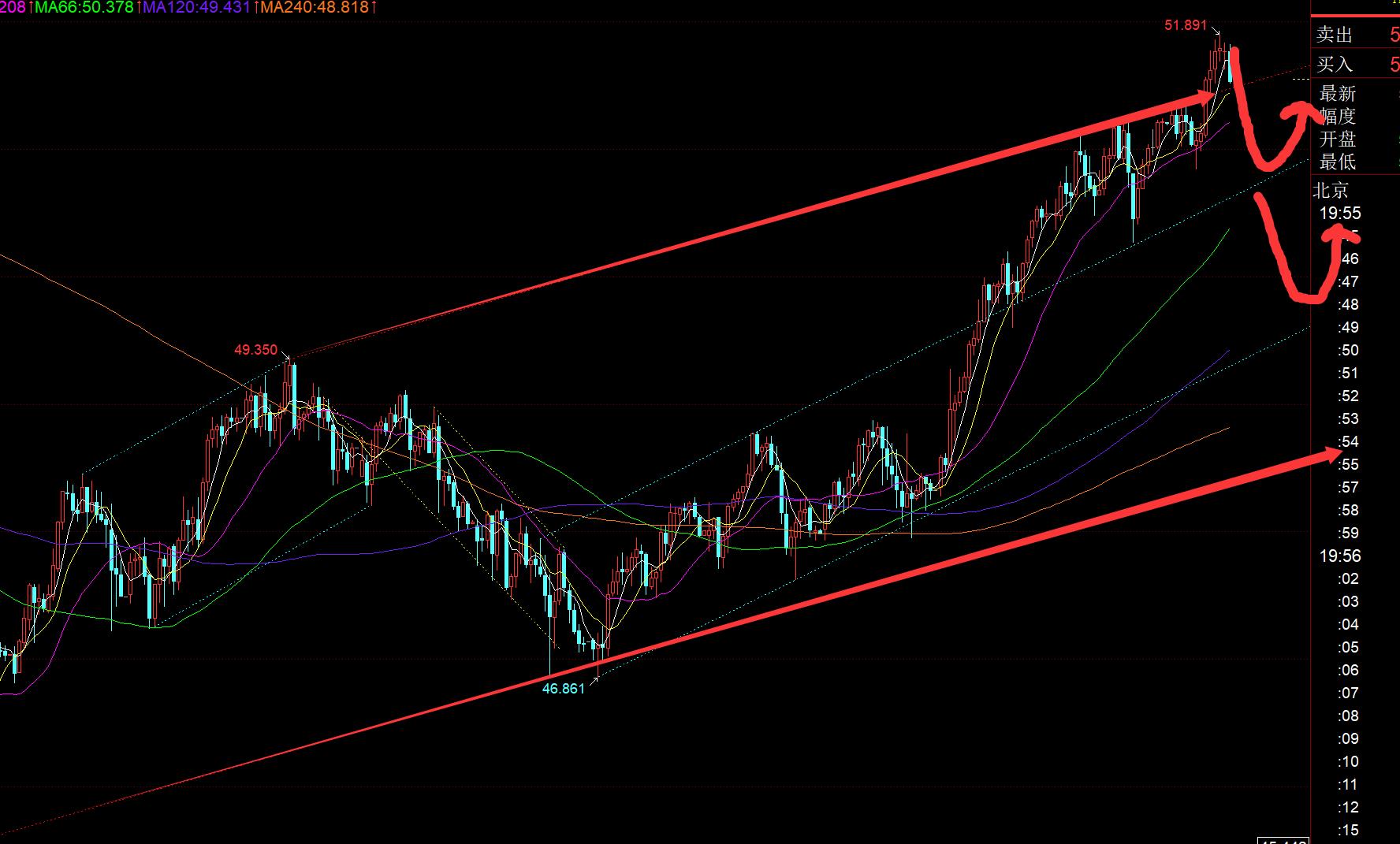 白銀方面:從上圖看,雖然亞歐盤走的比較堅挺,連陽刷了這幾日新高,暫時突破了紅色通道上軌;但短期macd嚴重的頂背離,加之低位還未修復完全,以及黃金的拖累,都可能會導致白銀突襲掉頭回落殺跌一波,一旦回到紅色通道之內,則日內高點就會承壓有效,下方支撐留意50.7藍色通道上軌、50,強支撐49.5上,拉低企穩則繼續看漲;